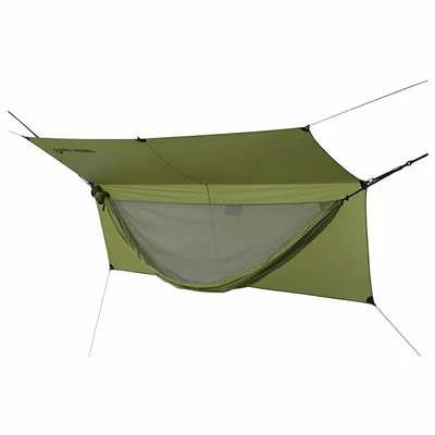 La forme rectangulaire asymétrique du tarp ainsi que ses nombreux points d’ancrage le rendent facilement adaptable à différentes configurations. En effet, avec huit points d’ancrage renforcés anti mèche avec haubans ajustables, vous pouvez installer la bâche comme bon vous semble. La bâche peut s’utiliser seule si vous dormez à même le sol dans un matelas gonflable ou en complément d’un hamac de camping, jouant ainsi le rôle d’une vraie tente de protection au-dessus du hamac (voir photo).