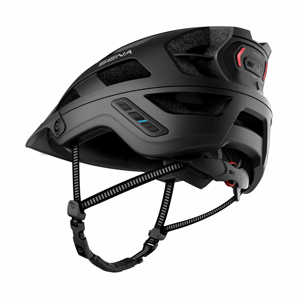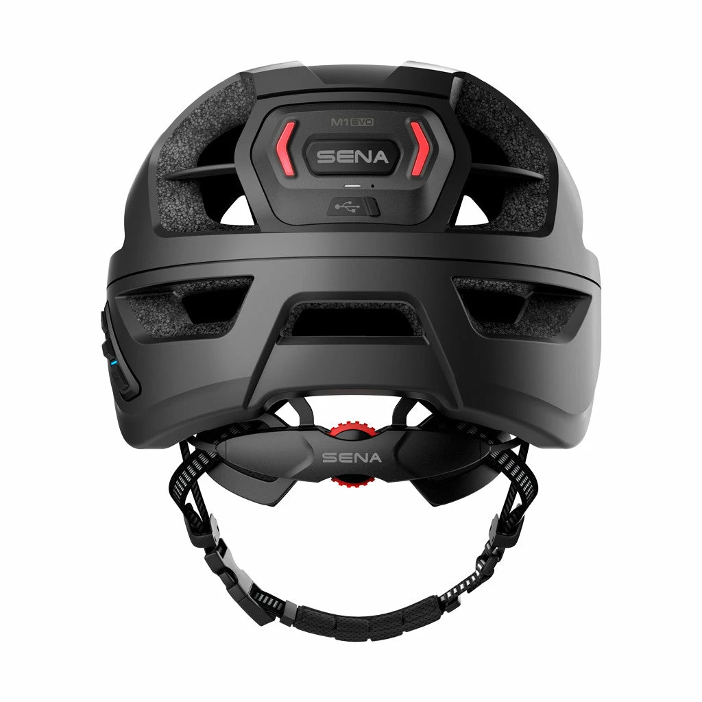 Ce casque VTT Sena renforce aussi la sécurité du cycliste en garantissant sa visibilité. En effet, des éléments réfléchissants sont présents le long des sangles. De plus, un feu arrière à LED y est installé et permet d’être vu à tout instant de la journée ou de la nuit grâce à 3 modes d’éclairage : Fixe, Flash jour, Flash nuit. Un mode Off est aussi disponible. L’autonomie du casque M1 Evo est comprise entre 12 et 18 h, selon si le feu est utilisé. À noter que la recharge complète de la batterie en lithium polymère prend 3 h. Elle se fait via le câble USB livré.