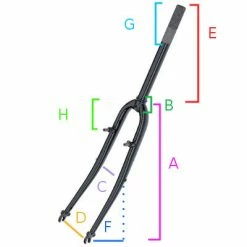 | A / longueur jambage | B / hauteur du té | C / Largeur intérieur jambage | D / Entraxe | E / Longueur du pivot | F / Angle ou déport de la fourche | G / Hauteur fixation étriers | H/ hauteur filetage | |