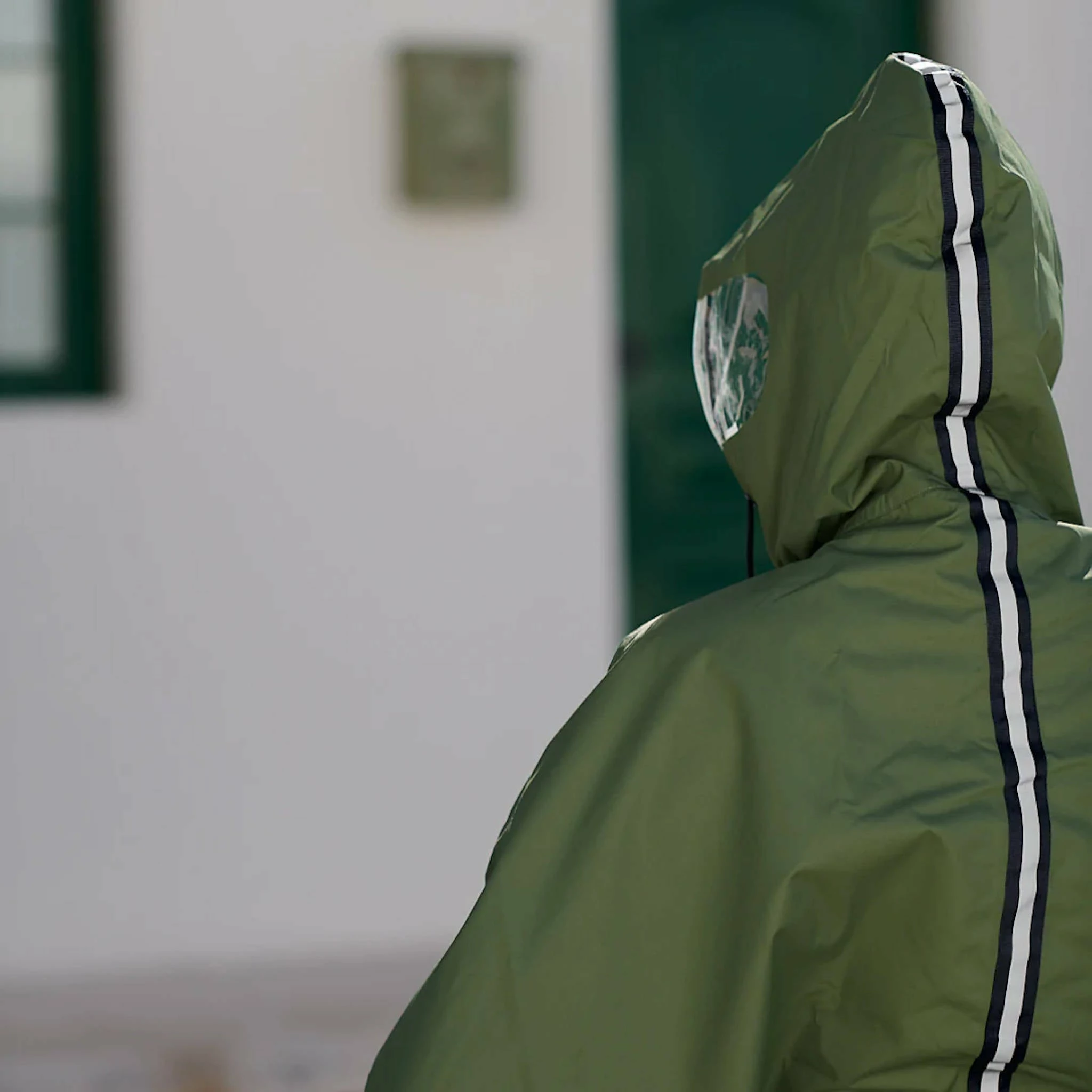 Des éléments réfléchissants sont disposés sur le poncho afin d’avoir une meilleure visibilité sur la route, notamment une longue bande à l’arrière qui va du bas du vêtement jusqu’à l’avant de la capuche. Idéal pour un usage urbain avec beaucoup de trafic.