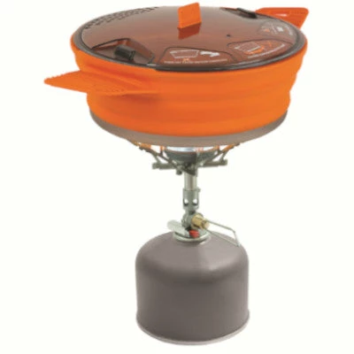 - La casserole X-Pot : la casserole a une contenance de 1.4 L et pèse 250 grammes. Elle se compose d’un corps en silicone souple et d’une base en aluminium anodisé ultra léger 6063-T6 afin de pouvoir être utilisée avec un réchaud. La casserole se compose également d’un couvercle transparent en plastique qui permet de surveiller la cuisson. Les poignées sont en silicone rainuré et servent à la fois à maintenir le couvercle fermé et à transporter la popote. Le tout pèse 349 grammes.